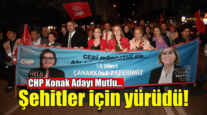 CHP Konak Belediye Başkan Adayı Nilüfer Çınarlı Mutlu, 18 Mart Çanakkale Zaferi ve Şehitleri Anma Yürüyüşü'ne de katıldı. CHP Konak ve Karabağlar ilçe örgütlerinin çağrısıyla toplanan ve yüzlerce kişiden oluşan kortej, ellerinde CHP ve Türk bayraklarıyla Fahrettin Altay Meydanı'ndan Uğur Mumcu Parkı'na kadar yürüdü. Seçim şarkıları ve marşlar eşliğinde zafer coşkusunun doruk yaptığı yürüyüşte, Mutlu'nun yanı sıra İzmir Milletvekili Ednan Arslan, Karabağlar Belediye Başkan Adayı Helil Kınay, Konak İlçe Başkanı Ozan Ali İlgazi, Karabağlar İlçe Başkanı Bülent Sözüpek, il ve ilçe yöneticileri, meclis üyesi adayları, partililer ve vatandaşlar yer aldı. "Geri dönmeyi asla düşünmediler" yazılı pankartın taşındığı yürüyüşte sık sık "Birleşe birleşe kazanacağız", "Türkiye laiktir laik kalacak", "Mustafa Kemal'in askerleriyiz" ve "Her şey çok güzel olacak" sloganları atıldı. CHP’li bazı gençler ellerine meşaleler alarak yürüyüşe katılırken, çok sayıda kişi de balkonlardan el sallayarak, slogan atarak destek verdi.