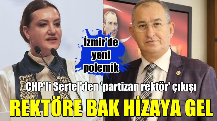 CHP'li Sertel, Rektör Hotar'ın gırtlağına kadar siyasetin içine batmış, partizan bir rektör olduğunu vurgularken, "Rektöre bak hizaya gel" çıkışını yaptı. Sertel mesajında, "Rektöre bak hizaya gel. Tunç Soyer hakkında twett atan AKP Gençlik Kolları Başkanını beğenmiş. Bu rektörden adaletli bir yönetim bekleyebilir misiniz? Gırtlağına kadar siyasetin içine batmış. Partizan Rektör" ifadelerini kullandı.