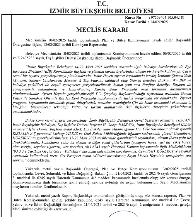 AK Partili Atmaca'nın açıklamalarının ardından Çin ziyareti ile ilgili mecliste oy birliği ile karar alındığı ortaya çıktı. SONKALE'ye konuşan İzmir Büyükşehir Belediyesi Başkan Vekili Levent Yıldır, Atmaca'ya tepki göstererek şunları söyledi: