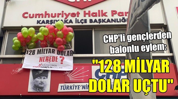 SONKALEİZMİR-İzmir Karşıyaka CHP ilçe binasında balonlu "128 milyar dolar nerede" eylemi yapıldı. CHP Karşıyaka Gençlik Kolları üyeleri ilçe binası tabelasının üzerine balonlara bağlı şekilde "128 milyar dolar nerede" yazılı pankart astı. Polis ekipleri müdahale etmek için geldiği sırada helyum gazı ile şişirilmiş balonlar serbest bırakılarak pankart gökyüzüne bırakıldı.
