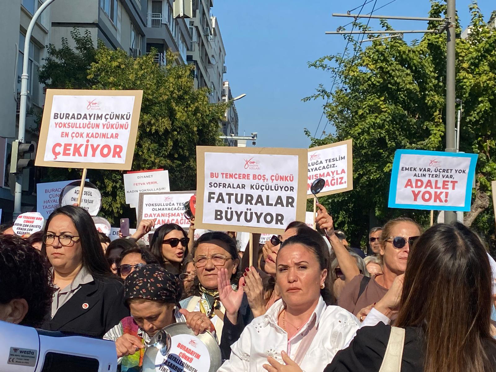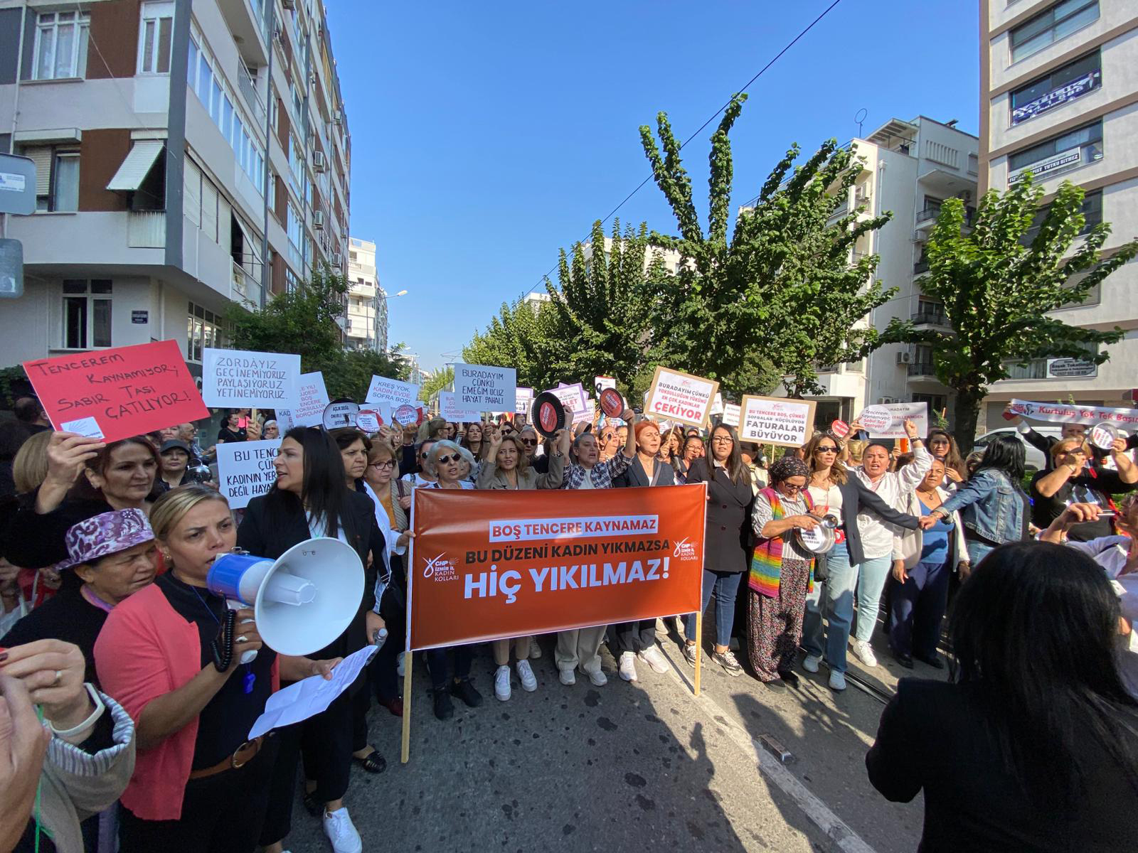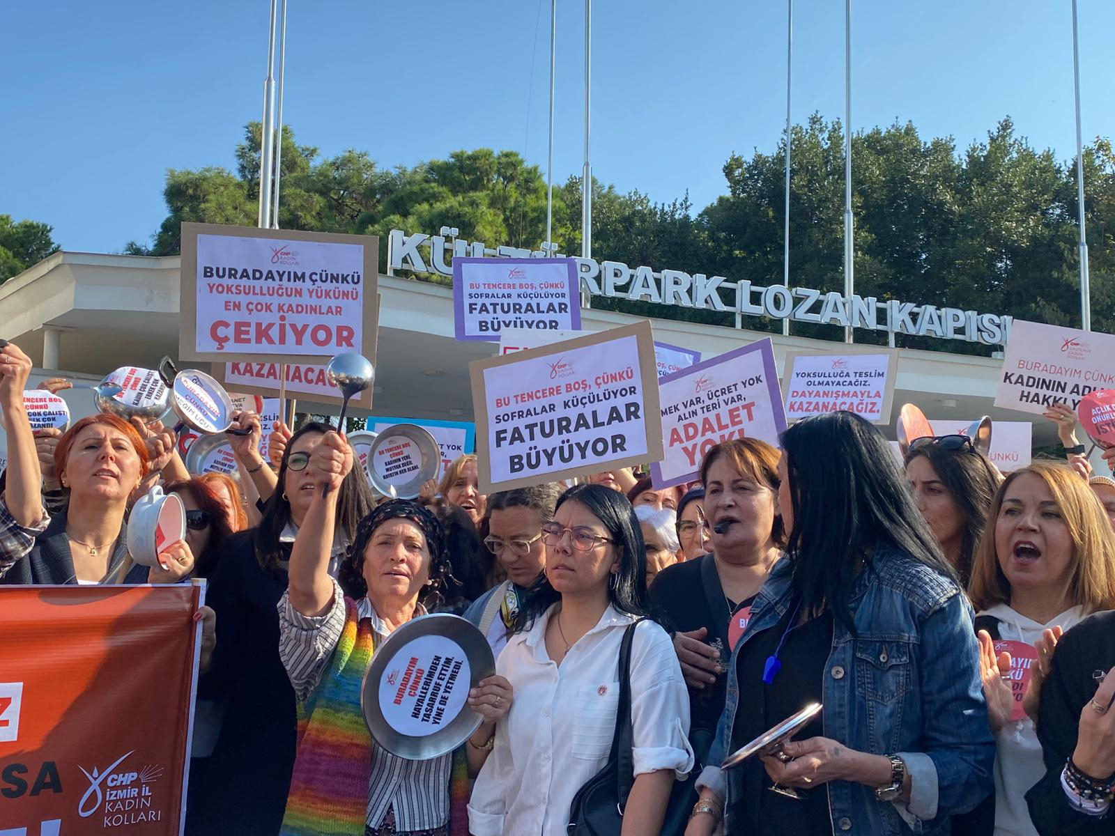 SONKALEİZMİR- Boş tencereler ve dövizler taşıyan kadınlar CHP İzmir İl Başkanlığı'ndan yürüyüşe başlayarak Kültürpark Lozan Kapısı önüne geldi. Burada toplanan kadınlar “Sarayda lüks, sofrada yokluk”, “Tencerem kaynamıyor, sabır taşı çatlıyor”, sloganları atarak oturma eylemi gerçekleştirdi.