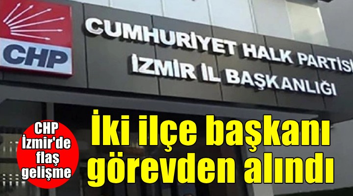 SONKALEİZMİR-CHP İzmir'de flaş bir gelişme yaşandı. Bugün toplanan il yönetim kurulu, Karabağlar İlçe Başkanı Bülent Sözüpek ve Bayraklı İlçe Başkanı Didem Gültekin’i görevden aldı.