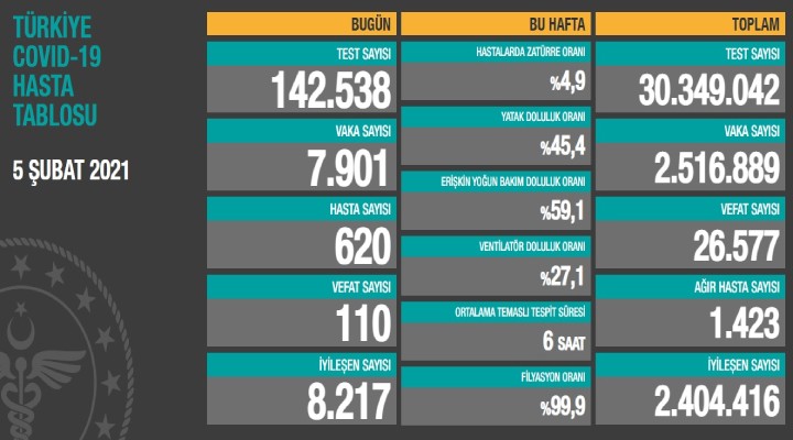Sağlık Bakanlığı'nca duyurulan 'Türkiye Covid-19 Hasta Tablosu'na göre; son 24 saatte yapılan 142 bin 538 testte 7 bin 901 vaka, 620 hasta tespit edildi. Virüs nedeniyle 110 kişi hayatını kaybederken, 8 bin 217 kişi de iyileşti. Bugünkü verilerle toplam test sayısı 30 milyon 349 bin 42 toplam vaka sayısı 2 milyon 516 bin 889, toplam vefat sayısı 26 bin 577, toplam ağır hasta sayısı 1423, toplam iyileşen hasta sayısı 2 milyon 404 bin 416 oldu.