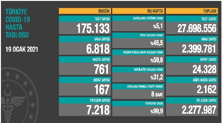 Sağlık Bakanlığı'nca duyurulan 'Türkiye Covid- 19 Hasta Tablosu'na göre; son 24 saatte yapılan 175 bin 133 testten 6 bin 818 vaka, 761 hasta tespit edildi. Virüs nedeniyle 167 kişi hayatını kaybederken, 7 bin 218 kişi de iyileşti. Bugünkü verilerle toplam test sayısı 27 milyon 698 bin 556, toplam vaka sayısı 2 milyon 399 bin 781, toplam vefat sayısı 24 bin 328, toplam ağır hasta sayısı 2 bin 162, toplam iyileşen hasta sayısı 2 milyon 227 bin 987 oldu.