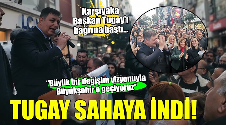 "İzmir'in sesi, halkın temsilcisi", "Halkın adayı İzmir'in başkanı", "Karşıyaka ve İzmir Cemil Tugay'a emanet" yazılı döviz ve pankartlar açılırken, "İşte örgüt, işte başkan", "Karşıyaka seninle gurur duyuyor" sloganları atıldı.