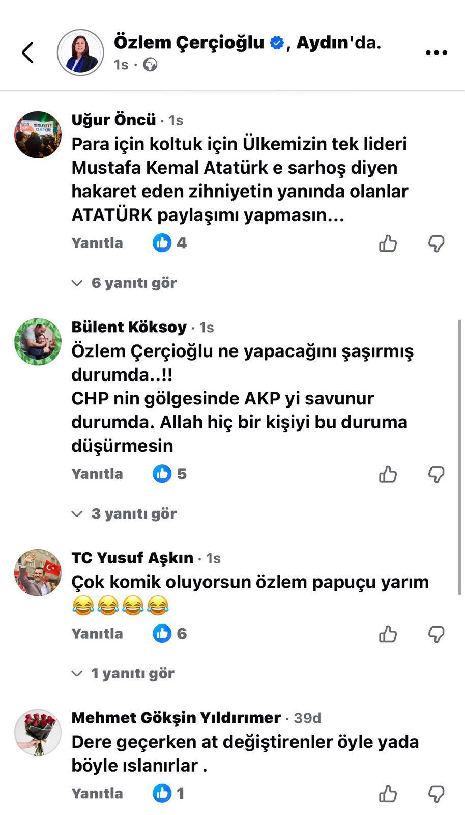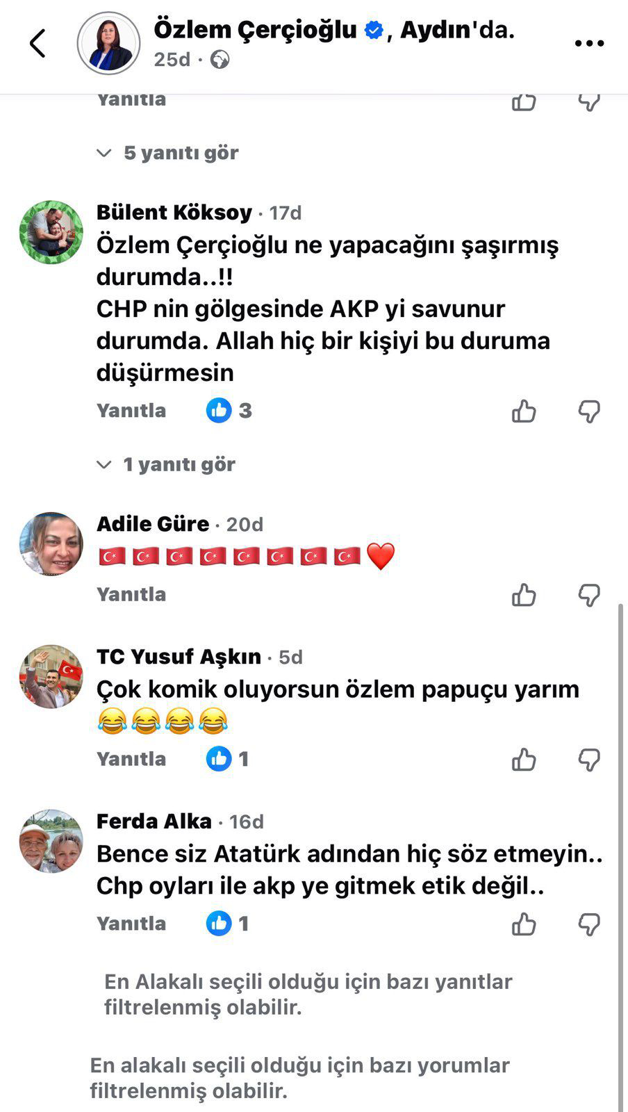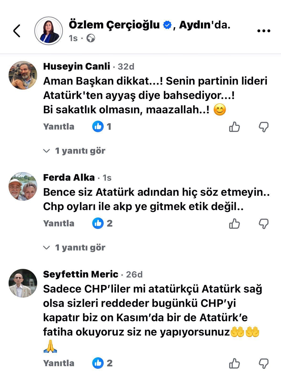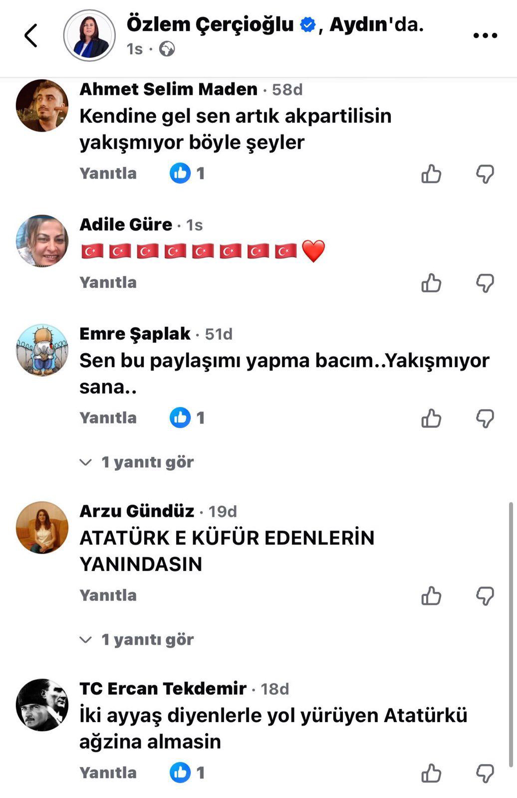 Aydın Büyükşehir Belediye Başkanı Özlem Çerçioğlu'nun Ulu Önder Mustafa Kemal Atatürk'ün vefatının 87. yılı dolayısıyla yaptığı paylaşıma tepki yağdı. Çerçioğlu'nun AK Parti'ye geçtikten sonra Atatürk'le ilgili paylaşımına CHP'li seçmenden büyük tepki geldi. Çerçioğlu tepkiler üzerine yorumların birçoğunu filtreledi.