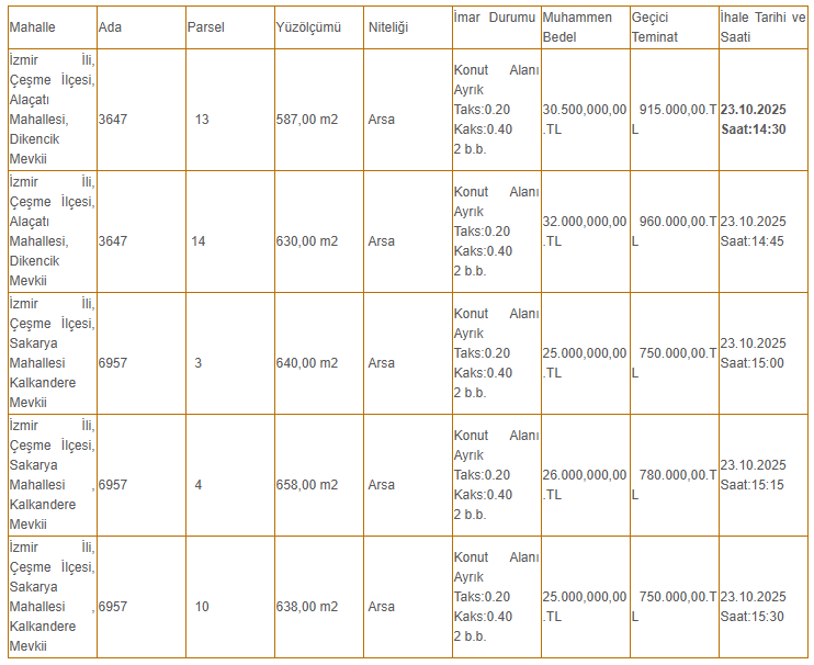 Alaçatı Dikencik mevkisindeki 3647 ada 13 parsele (547 metrekare) 30 milyon 500 bin TL, 3647 ada 14 parsele (630 metrekare) ise 32 milyon TL fiyat istendi.