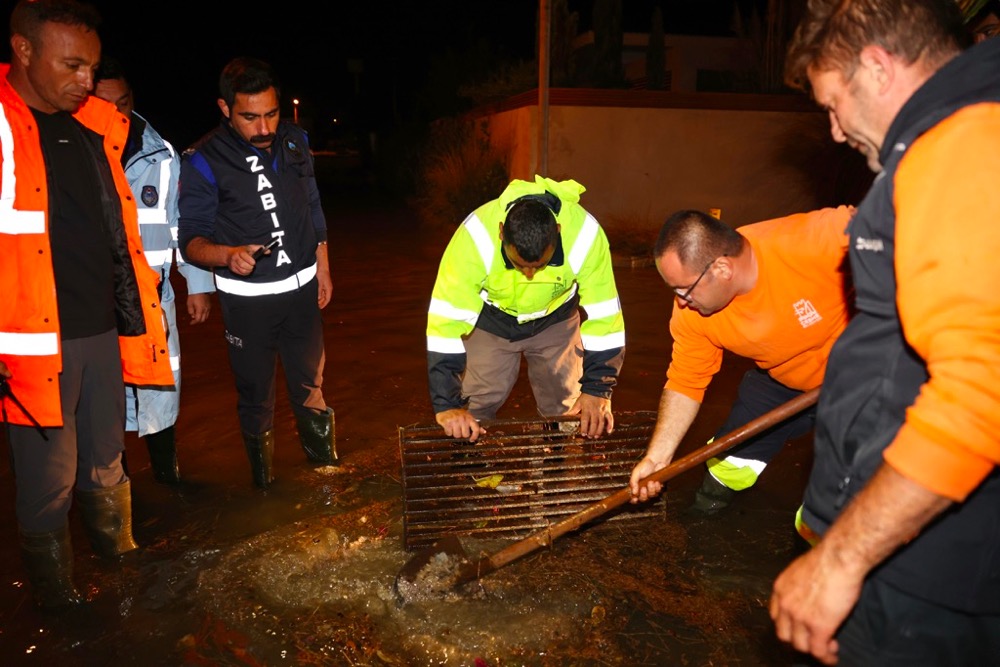 Çeşme Belediyesi 9 müdürlükten 269 personel ve 52 araç–iş makinesiyle tüm gece boyunca müdahalelerini aralıksız sürdürdü. Temizlik İşleri Müdürlüğü 170 personel ve 30’u aşkın araçla mazgal temizliği ve su birikintileriyle mücadele ederken; Fen İşleri Müdürlüğü iş makineleriyle su tahliyesi, yol açma ve yola taşınan malzemelerin temizliğini gerçekleştirdi.Zabıta ekipleri trafik güvenliğini sağlayarak su baskın riski taşıyan alanlarda yönlendirmeler yaptı. Park ve Bahçeler, Sosyal İşler, Destek Hizmetleri, Çözüm Merkezi, Bilgi İşlem ve İklim–Sıfır Atık ekipleri de sahada kesintisiz görev aldı.