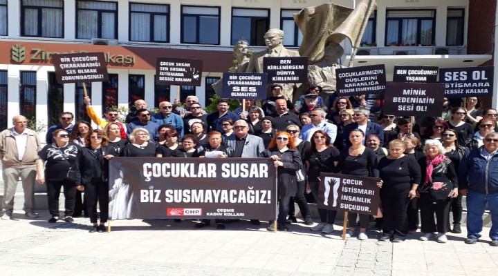 SONKALE- CHP'nin Çeşme Kadın Kolları üyesi bir grup, çocuklara cinsel istismara tepki amacıyla protesto eylemi yaptı. Siyah kıyafetler giyip "Çocuklar Susar Biz Susmayacağız" ve "Çocuk İstismarı İnsanlık Suçudur" yazılı dövizlerle Atatürk Anıtı önünde toplanan CHP'li kadınlara bazı erkekler de destek verdi. Burada bir basın açıklaması yapan CHP'li kadınlar, neredeyse hemen her gün yurdun dört bir yanından çocuklara yönelik şiddet, taciz ve istismar haberlerinin geldiğini belirterek, artık buna bir "dur" denilmesi gerektiğini söyledi. CHP'li kadınlar, çocuklara yönelik bu suçları işleyenlere kesinlikle ceza indirimi uygulanmamasını isterken, caydırıcı cezalar verilmesinin önemine işaret etti.