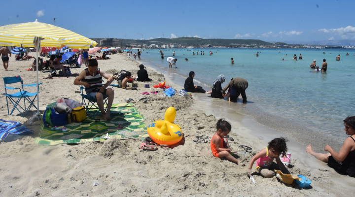 9 günlük bayram tatilinde otellerde yüzde 100 doluluğa ulaşılan Çeşme'nin plajları, ilk günden kalabalıklaştı. Bazı tatilciler, denize girerkenler, bazıları da güneşlenmeyi tercih etti.