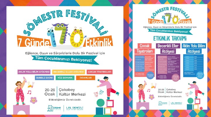 Çeşme Belediyesi, 20-26 Ocak tarihleri arasında Çakabey Kültür Merkezi’nde düzenlenecek Sömestr Festivali ile çocukları eğlenceli ve öğretici atölyelerle buluşturuyor. Festivalde, çocuklar bilimden sanata, el becerilerinden yaratıcılığa kadar geniş bir yelpazede etkinliklere katılma fırsatı bulacak.