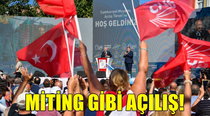 SONKALEİZMİR-Çeşme Belediyesi tarafından yeniden düzenlenen Cumhuriyet Meydanı'nın açılışı, görkemli bir törenle yapıldı. CHP lideri Kemal Kılıçdaroğlu, CHP Genel Başkan Yardımcıları Seyit Torun, Ali Öztunç, Ahmet Akın, CHP Genel Sekreteri Selin Sayek Böke, CHP Genel Başkan Başdanışmanı Tuncay Özkan, CHP İl Başkanı Deniz Yücel, İzmir Büyükşehir Belediye Başkanı Tunç Soyer, CHP İzmir Milletvekilleri ve ilçe belediye başkanlarının da katıldığı tören, yüzlerce yurttaşın da katılımıyla miting görüntülerini aratmadı. Meydana kurulan dev ekranda Çeşme Belediyesi'nin yaptığı çalışmaların detaylı bir şekilde anlatıldı.