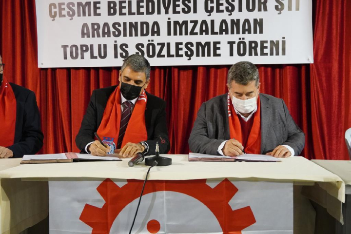 Çeşme Belediyesi ve DİSK/Genel-İş Sendikası 4 Nolu Şubesi arasında belediyede görev yapan 330 personeli kapsayan Toplu İş Sözleşmesi imzalandı. Çakabey Kültür Merkezi’nde Toplu İş Sözleşme töreni gerçekleştirildi. Çeşme Belediye Başkanı M. Ekrem Oran ve DİSK / Genel İş Sendikası Genel Başkanı Remzi Çalışkan arasında imzalanan 2 yıl süreli sözleşmeyle işçilerin taban ücretlerine zam yapıldı.