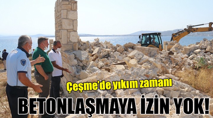Çeşme Belediyesi tarafından Çeşme’de deniz kenarı ve Sit Alanı’na inşa edilen taş bina yıkıldı. Bina sahibi G.S.E’ye kararı gönderen belediye ekipleri, bir ay içerisinde karara uyulmaması üzerine iş makineleri aracılığıyla binanın yıkımını gerçekleştirdi.