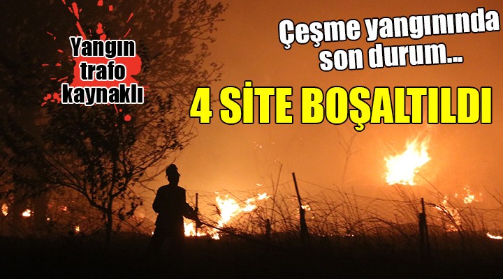 Ildır Mahallesi'nde bulunan otluk alanda henüz bilinmeyen nedenle çıkan yangına ekiplerin müdahalesi sürerken, ekiplerin sayısı artırıldı. Çeşme Kaymakamı Ünal Çakıcı, "Yangına müdahale devam ediyor. Tedbir amaçlı 4 sitemizi boşalttık." dedi. Boşaltılan sitelerdeki bazı vatandaşlar eşyalarını almak için evlerine geri döndü. Bunun üzerine jandarma ekipleri, boşaltılan siteler önünde önlem aldı. Yangına çok sayıda arazöz, dozer ve çok sayıda orman işçisiyle müdahale ediliyor. Rüzgar nedeniyle büyüyen yangına müdahale eden ekipler, alevlerin yerleşim yerlerine gelmemesi için çaba harcıyor. Havanın karanlık olması nedeniyle uzun süre helikopter ve uçakla müdahale yapılmadı.