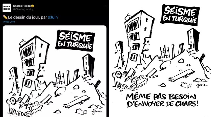Charlie Hebdo, “Türkiye’de deprem” dedi, yıkılmış bir şehir çizdi. O karikatürün üstüne şunu yazdılar: “Tank göndermeye bile gerek yok.” Charlie Hebdo, bu karikatürü “günün çizimi” olarak yayınladı.