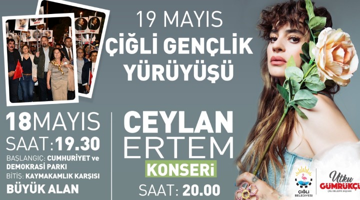 Çiğli Belediyesi'nin organize edeceği 19 Mayıs Atatürk'ü Anma Gençlik ve Spor Bayramı kutlamaları 18 Mayıs Perşembe günü 19:30'da Cumhuriyet ve Demokrasi Parkı önünde Çiğli Gençlik Yürüyüşü ile başlayacak. Yürüyüşün tamamlanacağı Kaymakamlık karşısındaki büyük alanda düzenlenecek konserde alternatif rock müziğinin sevilen isimlerinden Ceylan Ertem sahne alacak.