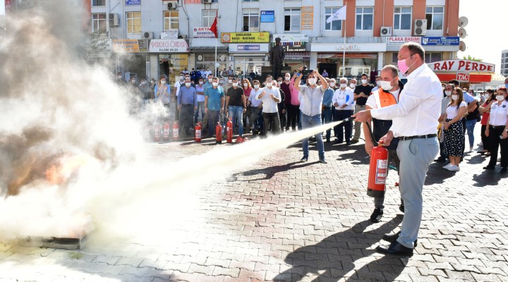 Çiğli Belediye Başkanı Utku Gümrükçü ile birlikte tüm kurum çalışanları 7 katlı belediye binasını birkaç dakikada terk etti. Ayrıca belediye personeline çıkan alevlere doğru müdahale yöntemleri pratik olarak anlatıldı. Başkan Utku Gümrükçü ile birlikte bazı belediye personeli, uzmanlarca gösterilen doğru açı ve yöntemle alevlere müdahele ederek söndürme işlemi gerçekleştirdi. Öte yandan belediye personeline belediye meclis salonunda olası bir yangın durumunda acil olarak yapılması gerekenlerle ilgili brifing verildi.