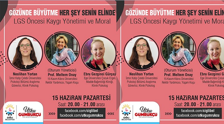 Tüm dünyada olduğu gibi ülkemizde de halk sağlığını tehdit eden Covid-19 salgını nedeniyle 20 Haziran’da yapılacağı açıklanan LGS sınavına girecek öğrenciler için bugün (Pazartesi) saat 20:00’de online kaygı yönetimi ve moral toplantısı düzenlenecek. 15 Kasım Kıbrıs Üniversitesi Rektör Yardımcısı Prof. Dr. Meltem Onay’ın moderatörlüğünde gerçekleştirilecek “LGS Öncesi Kaygı Yönetimi ve Moral” konulu online toplantıya İzmir Katip Çelebi Üniversitesi Psikoloji Bölümü Araştırma Görevlisi Klinik Psikolog Neslihan Yortan ile Ege Üniversitesi Çocuk-Ergen, Madde Bağımlılığı Kliniği Psikologu Ebru Gezginci Gürçay katılım gösterecek. Toplantı, Çiğli Belediyesi ve Başkan Utku Gümrükçü’nün Resmi Facebook hesaplarından canlı olarak izlenebilecek.