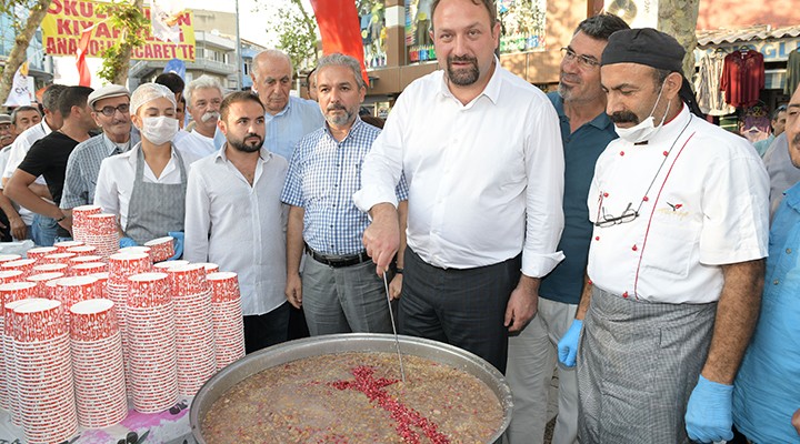 Muharrem Ayı’nın anlam ve önemine dair yapılan konuşmaların ardından Başkan Utku Gümrükçü, dev kazanların başına geçerek vatandaşa aşure dağıttı.