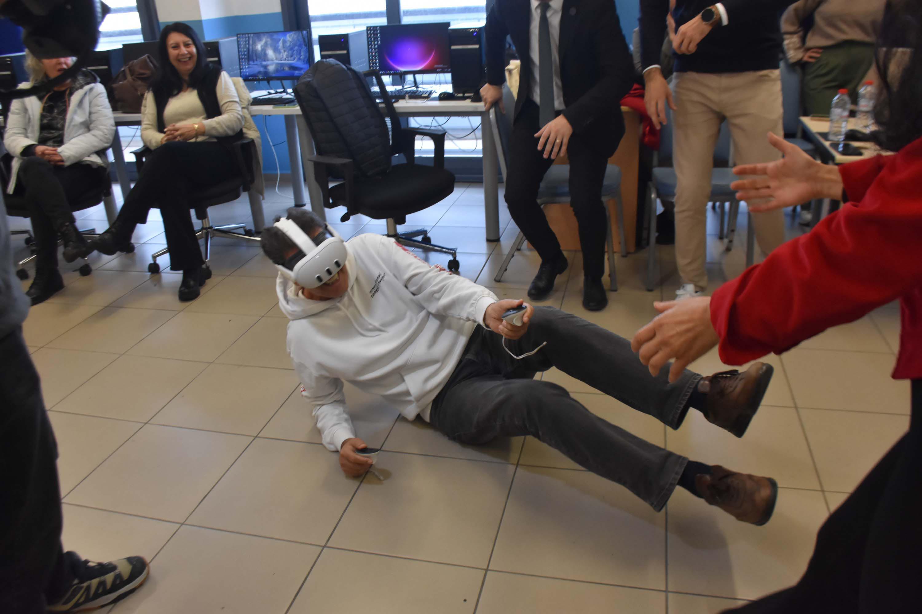 Narlıdere İlçe Milli Eğitim Müdürlüğü tarafından, eğitimin hızla gelişen yapay zeka ve dijital teknolojilerle birlikte yeniden şekillenmesinden hareketle öğretmenlere yönelik 'Teknoloji Entegrasyonu Uygulamaları' çalıştayı başlatıldı. Dokuz Eylül Üniversitesi (DEÜ) Eğitim Fakültesi ile yürütülen üniversite-okul iş birliği kapsamında, eğitim fakültesinde görev yapan öğretim üyeleri ve lisansüstü öğrenciler tarafından çalıştay süresince yapay zeka, dijital öğrenme ortamları ve teknoloji entegrasyonu başlıklarında eğitimler verildi. Çalıştayın ikinci etabında, coğrafya ve sosyal bilgiler öğretmenlerine yönelik olarak Prof. Dr. Raziye Çakıcıoğlu Oban, Arş. Gör. Erim Cantürk, yüksek lisans öğrencileri Ekrem Özcan ve Mehmet Akif Kılıç tarafından 'VR ve metaverse ile iklim deneyimi' konulu eğitim gerçekleştirildi. Eğitim sırasında ortamı algılayan kameraya sahip sanal gerçeklik gözlüğü takan öğretmenler, zaman zaman zor anlar yaşadı.