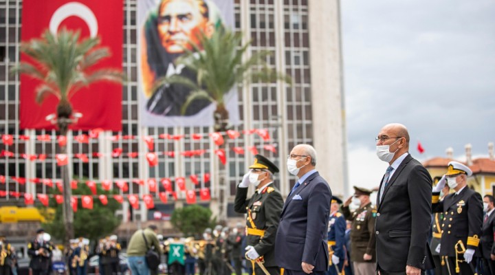 Törende Cumhuriyet Meydanı'ndaki Atatürk Anıtı'na İzmir Valiliği, Ege Ordusu ve Garnizon Komutanlığı ile İzmir Büyükşehir Belediyesi'nin çelenkleri konuldu. Tören, saygı duruşu ve İstiklal Marşı'nın ardından son buldu.
