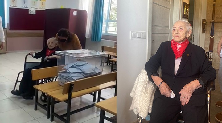 101 yaşındaki Zekiye Sertoğlu, bir kadın belediye başkanı tarafından yönetilen İzmir Karaburun’da, İskele Mahallesi’ndeki evinden Gazi Mustafa Kemal Atatürk baskılı fularıyla ve tekerlekli sandalyesi ile çıkarılarak oyunu kullanmak üzere kayıtlı bulunduğu sandığa götürüldü.