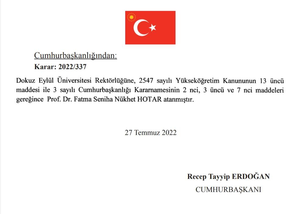 Bugünkü Resmi Gazete'de yayımlanan kararla AK Parti eski Genel Başkan Yardımcısı Prof. Dr. Nükhet Hotar, yeniden Dokuz Eylül Üniversitesi rektörlüğü görevine atandı.