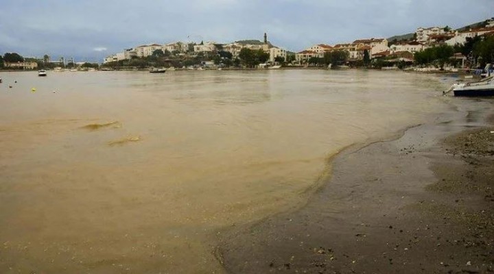 Elektrik kesintisinin de yaşandığı ilçede yağan yağmur sonrası Kumluk Plajı'nda denizin rengi, derelerin taşıdığı çamurlu yağmur suları nedeniyle kahverengiye döndü.