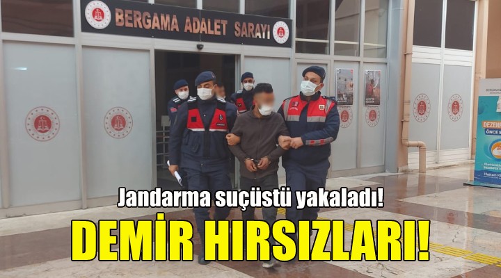 Bergama'nın Tepeköy Mahallesi'nde bulunan bir demir atöyesinden hırsızlık yapıldığı ihbarı üzerine jandarma ekipleri bölgeye sevk edildi. Kısa sürede olay yerine ulaşan İzmir İl Jandarma Komutanlığı'na bağlı ekipler E.D ve B.G isimli şahısları demirleri çalarken suçüstü yakaladı.