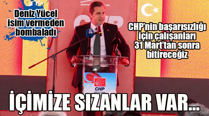 İsim vermeden, CHP'nin başarısızlığı için çalışanlar olduğunu vurgulayan Deniz Yücel, şöyle devam etti: "Biz kimlerin neler yaptığını, kimlerin CHP’nin adaylarına kaybettirmek üzere kurgu yaptığını çok iyi biliyoruz. Tarihe not düşeyim. Ben varsam parti var, ben yoksam parti yok, benden sonra tufan diyen zihniyeti 31 Mart’tan sonra bitireceğiz. Partisini terk eden, ihanet eden, mevki-makam-koltuk için yanlış yollara sapanlara CHP’de yer yok. CHP’li gibi görünen, bizim içimize sızanlar ama CHP’nin başarısızlığı üzerine çalışanlara CHP’de yer yok. Bu anlayışı 31 Mart'tan sonra bitireceğiz.”