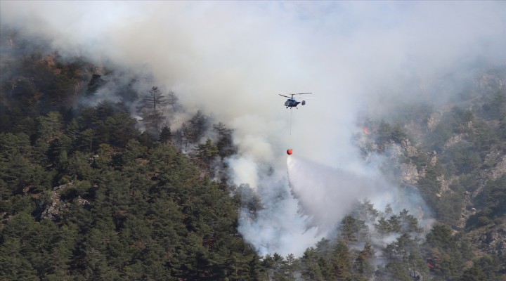 Dağlık bir arazide olduğu görülen ormanlık alana sadece helikopterlerle müdahale edilebiliyor.
