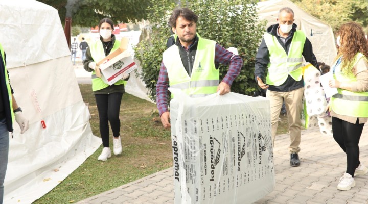 İzmir Büyükşehir Belediyesi Sosyal Hizmetler Dairesi Başkanlığı ekiplerince yürütülen dağıtımlara gönüllüler de destek veriyor. Bornova Sakarya Caddesi üzerinde İzmir Büyükşehir Belediyesi'nin oluşturduğu iki çadır alanında geçici olarak barınan depremzedelere battaniye, uyku tulumu, çadır matı, içinde sabun, şampuan, diş macunu, kişisel hijyen ürünleri, maske, dezenfektan, kolonya, ıslak mendil, sıvı sabun, tuvalet kağıdı, kağıt havlu, çöp torbasının bulunduğu hijyen paketi, ışıldak, çocuk kitabı, bebek bezi ve maması, pil ve çocuklar için de oyuncak dağıtıldı. İzmir Büyükşehir Belediyesi gönüllülerin de desteği ile ihtiyaç duyulan malzemelerin dağıtımını sürdürülecek.