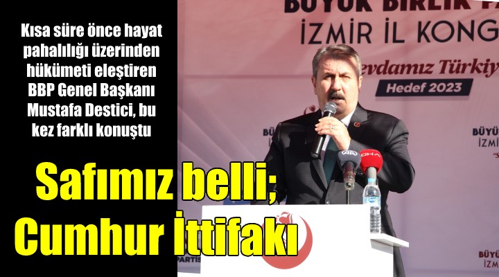 BBP'nin tarafının belli olduğunu vurgulayan Destici, "Bizim safımız belli, biz Cumhur İttifakı'nın bir bileşeniyiz ve Cumhur İttifakı çatısı altında, kendi adı, amblemi ve adayları ile yer alacak. Daha güçlü bir grupla TBMM'de temsil imkanı yakalayacaktır. Cumhurbaşkanı adayımız da 2018'de olduğu gibi Cumhurbaşkanımızdır. Hangi algıyı oluştururlarsa oluştursunlar, yapılmamış anketleri yayınlatırlarsa yayınlatsınlar, haziran ve mayıs ayında yapılacak seçimlerde sizin desteklerinizle hem cumhurbaşkanlığı seçimini kazanacağız hem de mecliste çoğunluğumuzu artırarak devam edeceğiz" dedi. .