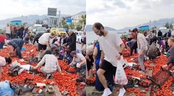 Olay yerine toplanan vatandaşlar, tır şoförüne yardım etmek yerine domatesleri kendileri için topladı.