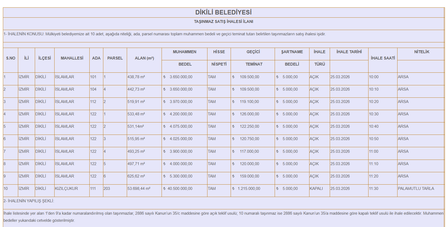 SONKALEİZMİR-Dikili Belediye Başkanı Adil Kırgöz, başkanlığının ikinci döneminde de dudak uçuklatan satışlara imza atıyor. Geçmişte zeytinlik, tarla, çamlık gibi taşınmazları satan Kırgöz, şimdi de 77 milyon 270 bin TL'lik yeni bir ihaleye hazırlanıyor.