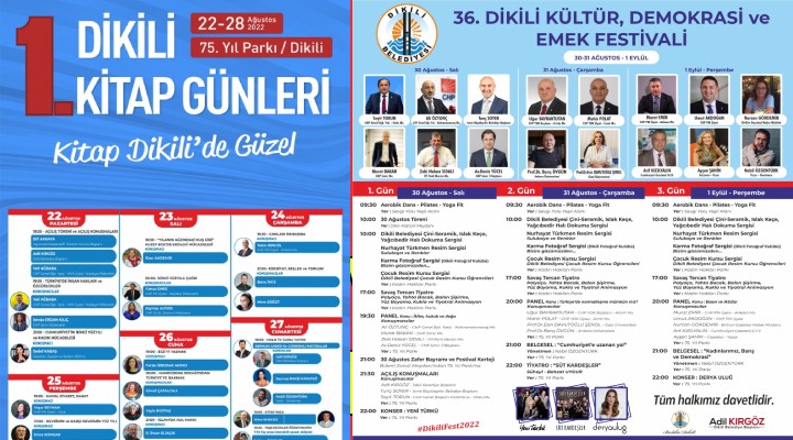 Yaklaşık iki hafta boyunca Dikili’de edebiyat, kültür ve sanat rüzgarlarının eseceğini belirten Dikili Belediye Başkanı Adil Kırgöz, “Kent tarihinde bir ilki gerçekleştirerek ‘1. Dikili Kitap Günleri’ne ev sahipliği yapıyoruz. Güneşin en güzel battığı yer Dikili’mizde, denizden esen meltem rüzgarının iyot kokusuyla beraber kitap kokusunu da sokaklarımızda dolaştıracağı, şiirlerin yankılanacağı bu anlamlı etkinlikte ülkemizin değerli yazar, edebiyatçı, şair ve siyasetçilerini panel ve imza günlerinde halkımızla buluşturuyoruz. 30-31 Ağustos ve 1 Eylül tarihlerinde sergiler, konserler, tiyatro, belgesel gösterimleri, spor etkinlikleri ve paneller ile zenginleştirdiğimiz ‘36. Dikili Kültür, Demokrasi ve Emek Festivali’ni gerçekleştireceğiz. Ebedi Başkomutanımız Mustafa Kemal Atatürk önderliğinde Türkiye Cumhuriyeti’nin temellerinin atıldığı 30 Ağustos Zaferi’nin 100. yıl dönümünü de festivalimiz kapsamında coşkuyla kutlayacağız” diyerek tüm vatandaşları her iki etkinliğe davet etti.