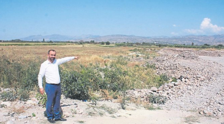 (Fotoğrafta: AK Parti İlçe Başkanı Tahsin Şekerci, satılan arazileri gösteriyor)
