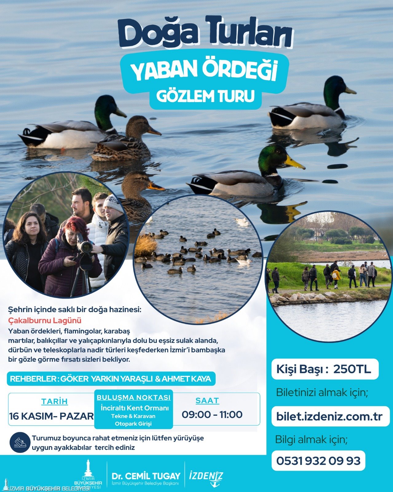 Doğa turları kapsamında düzenlenecek Yaban Ördeği Gözlem Turu, Çakalburnu Lagünü’nde gerçekleştirilecek Doğaseverlere nadir kuş türlerini yakından görme fırsatı sunacak turda katılımcılar Çamurcun, Kaşıkgaga ve Yeşilbaş gibi yaban ördeği türlerinin yanı sıra flamingo, karabaş martı, balıkçıl ve yalıçapkınlarını dürbün ve teleskoplarla gözlemleyebilecek. 16 Kasım 2025 Pazar günü 09.00 – 11.00 saatleri arasında ilki gerçekleştirilecek turda buluşma noktası İnciraltı Kent Ormanı Tekne ve Karavan Otoparkı Girişi olarak belirlendi. Katılım ücreti yetişkin için 250 TL olarak belirlendi. 0–6 yaş ücretsiz, 6–12 yaş yüzde 50 indirimli, kontenjan 30 kişiyle sınırlı.