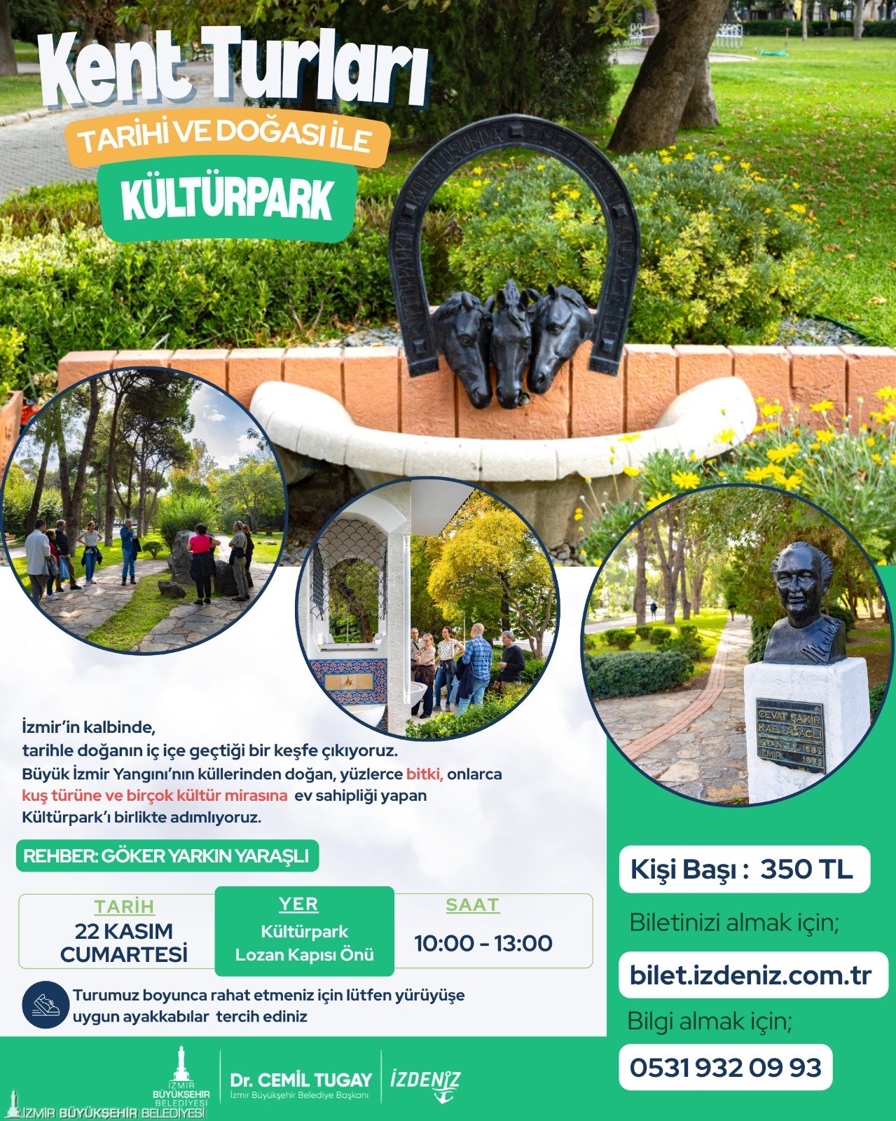 Rehber eşliğinde yapılan Kültürpark Turu’nda Atatürk’ten Behçet Uz’a, İsmet İnönü’den Halikarnas Balıkçısı Cevat Şakir’e, Nejat Uygur’dan Zeki Müren’e uzanan Cumhuriyet tarihinin izleri keşfediliyor. Katılımcılar, Kültürpark’ın sanat eserlerini, tarihi yapılarını ve geçmişin eğlence mekânlarını gezerken, 133 farklı türden 7 bini aşkın bitki ve 50’ye yakın kuş türü hakkında bilgi edinebiliyor. 22 Kasım 2025'te yapılacak turun bilet fiyatı 350 TL olarak belirlendi.