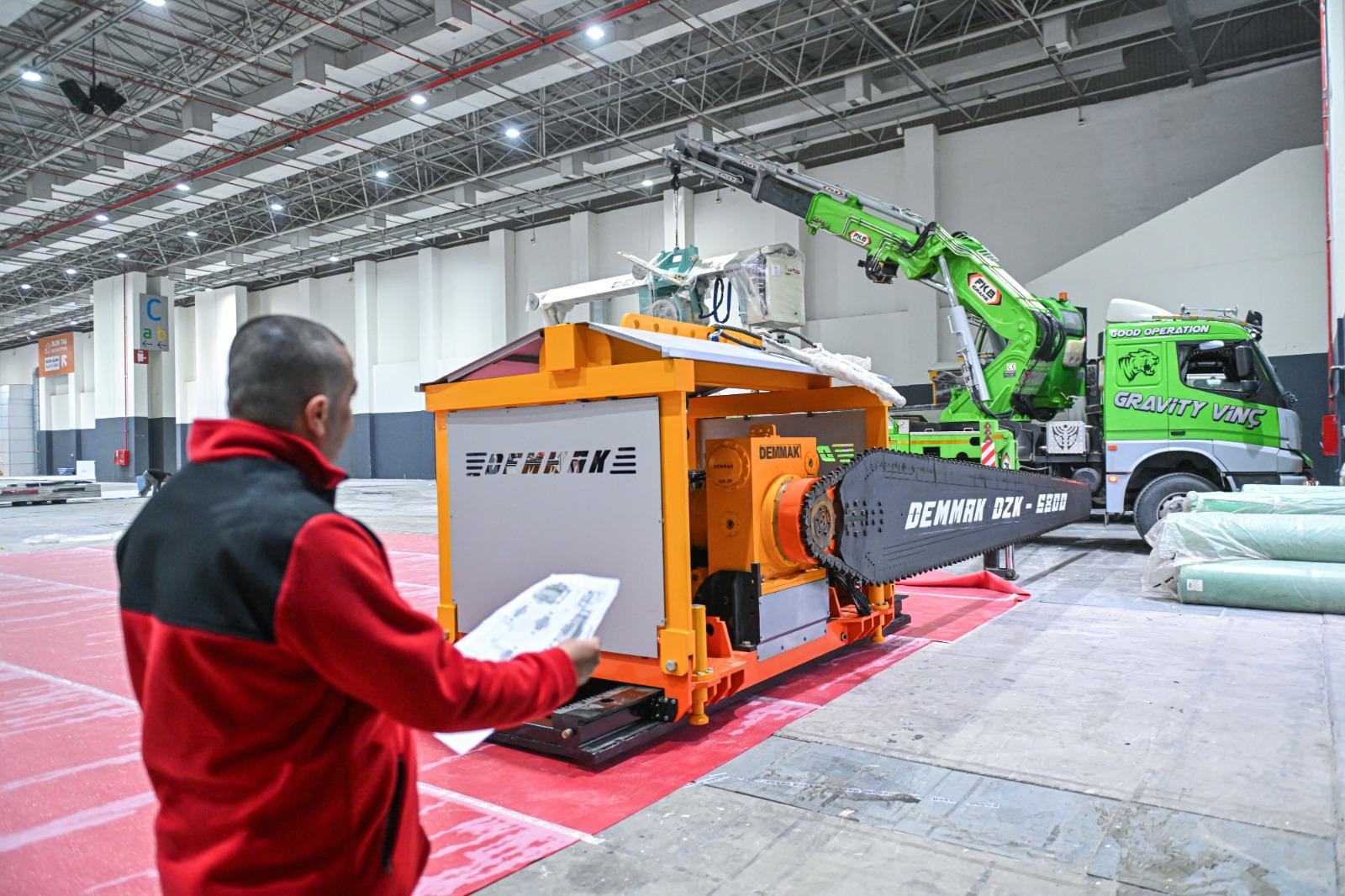Doğal taş ürünlerinin ve makinelerin sergileneceği hollerde de kurulum başladı. Makine ve teknoloji firmalarına özel olarak ayrılan C Hol’de alana yerleştirilen ilk makine, Demmak Makine tarafından üretilen yerli, 12 tonluk blok taş kesme makinesi oldu.