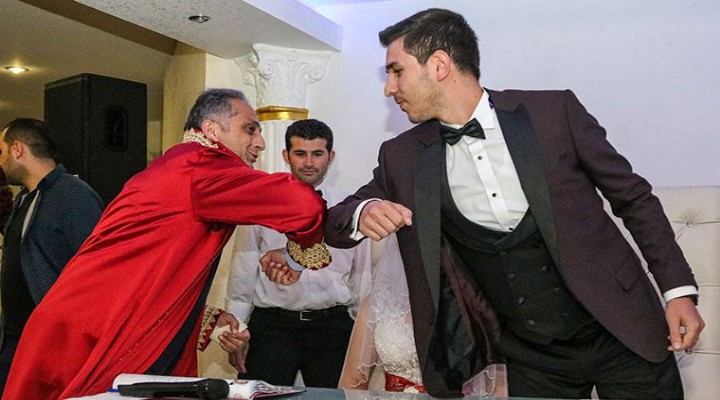 Çiftin nikah töreninde de benzer durum yaşandı. Nikah masasına oturan çiftin nikahını, Antalya Büyükşehir Belediyesi'nin nikah memuru Mustafa Pilavcu kıydı. İmzaların atılmasıyla birlikte evlilik cüzdanını alan damat Yeşil, Pilavcu ile tokalaşmak istedi. Ancak aldıkları önlem nedeniyle tokalaşmayan ikili dirseklerini birbirine vurdu. Yaşanan bu olay davetliler arasında gülüşmelere neden oldu.