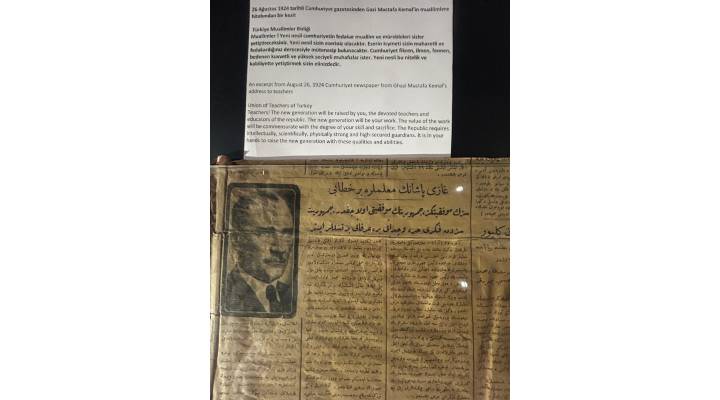 Sergide ayrıca, Başöğretmen Atatürk’ün öğretmenlere seslendiği metnin yayımlandığı 26 Ağustos 1924 tarihli Cumhuriyet Gazetesi’nin orijinal nüshası ile dönemin öğretmenlerine ait orijinal sicil defterleri de yer alıyor.