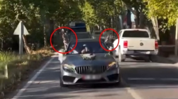 Yalova'da düğün konvoyu içerisinde yer alan otomobildeki damat M.K. ile yanında oturan gelin D.K , ellerine aldıkları tabanca ile havaya rastgele ateş açtı. O anlar, cep telefonu kamerasına yansıdı.