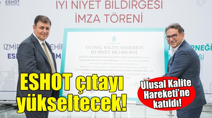 İzmir Büyükşehir Belediyesi, toplu taşımanın can damarlarından ESHOT Genel Müdürlüğü’nün verimliliğini artırma, toplu ulaşım konforunu yükseltme, kurumun ve çalışanların çağın koşullarına göre yenilenip gelişmesini sağlama hedefiyle Türkiye Kalite Derneği (KalDer) İzmir Şubesi ile Ulusal Kalite Hareketi İyi Niyet Bildirgesi’ni imzaladı. Fuar İzmir C Holü Fuaye Alanı’nda düzenlenen törene, İzmir Büyükşehir Belediye Başkanı Dr. Cemil Tugay ile KalDer İzmir Şubesi Yönetim Kurulu Başkanı Hakan Ünlü, İzmir Büyükşehir Belediyesi Genel Sekreteri Barış Karcı, ESHOT Genel Müdürü Turgay Bozoğlu, İZFAŞ Genel Müdürü Canan Karaosmanoğlu Alıcı ile belediye bürokratları ve kurum çalışanları katıldı.