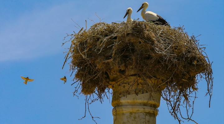 Antik Tiyatro önünde yer alan Liman Caddesi'ndeki antik Bizans sütunu üzerinde yuva yapan 4 leylek görüldü. Geçmişi milattan önce 3. yüzyıla dayanan ve yeni tip koronavirüs (Kovid-19) ile mücadele sonrası normalleşme süreciyle yeniden misafirlerini ağırlamaya başlayan antik kentte leylekler turistlerin de ilgisini çekiyor.