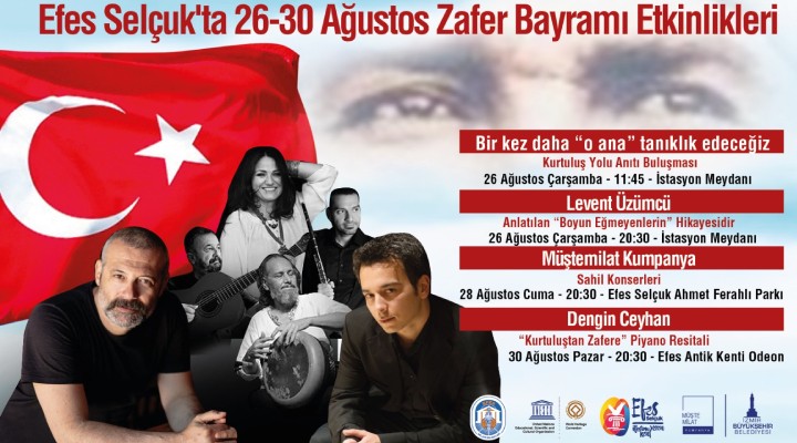 26 – 30 Ağustos tarihleri arasında düzenlenecek Zafer Haftası etkinlikleri kapsamında ilk olarak 26 Ağustos günü saat 11.45’te İstasyon Meydanı’nda Kurtuluş Yolu Anıtı Buluşması gerçekleşecek. Efes Selçuk Belediyesi ve sivil toplum kuruluşlarının katılımıyla gerçekleşecek buluşmada Heykeltıraş Mehmet Aksoy tarafından İstasyon Meydanı’nda yapılan “Kurtuluş Yolu Anıtı’nda” Ulu Önder’in siluetinin gölgesinin düştüğü “o ana” katılımcılar bir kez daha tanık olacak. Vatandaşların ve sivil toplum örgütlerinin katılımıyla gerçekleşecek etkinlikte Utku Erişik Nazım Hikmet’in Kuvay-ı Milliye Destanı’ndan bir parça okuyacak.