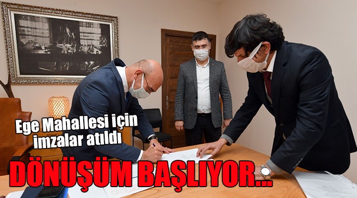 İzmir Büyükşehir Belediyesi yüzde 100 uzlaşı ve yerinde dönüşüm anlayışıyla kentsel dönüşüm çalışmalarını sürdürüyor. İzmir Büyükşehir Belediye Başkanı Tunç Soyer, Ege Mahallesi’nin birinci etabı için açılan kat karşılığı anahtar teslim yapım ihalesi kazanan Aslanoğlu Altyapı ve Üst Yapı A.Ş. ve Baykan Otomobil A.Ş. Ortak Girişimi yetkilileriyle projeyi başlatacak sözleşmeyi imzaladı. Başkan Tunç Soyer, “Bu, İzmir için çok kıymetli bir adım. İzmir için lokomotif olacak bir projeye imza atıyoruz” diye konuştu.