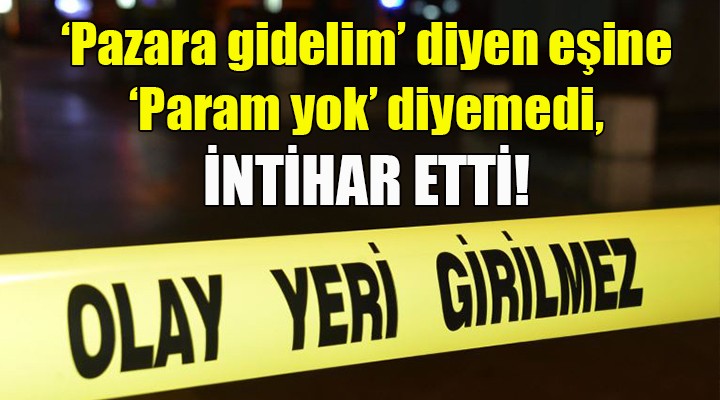 Türkiye'nin gündemine oturan intihar vakalarına bir yenisi daha eklendi. 'Pazara gidelim' diyen eşine parası olmadığını söyleyemeyen Ali Kabasakal, av tüfeği ile kendisini vurarak intihar etti. Ciddi Gazete'de yer alan habere göre, eşinin "Pazara gidelim" demesi üzerine "Sen biraz oyalan" diyerek banyoya giren Ali Kabasakal, av tüfeği ile kendisini vurarak intihar etti. Cebinden sadece 1,5 lira çıktığı öğrenilen Kabasakal, otopsisi yapıldıktan sonra İzmir Kemalpaşa Yukarı Yenmiş Köyü'nde defnedildi.