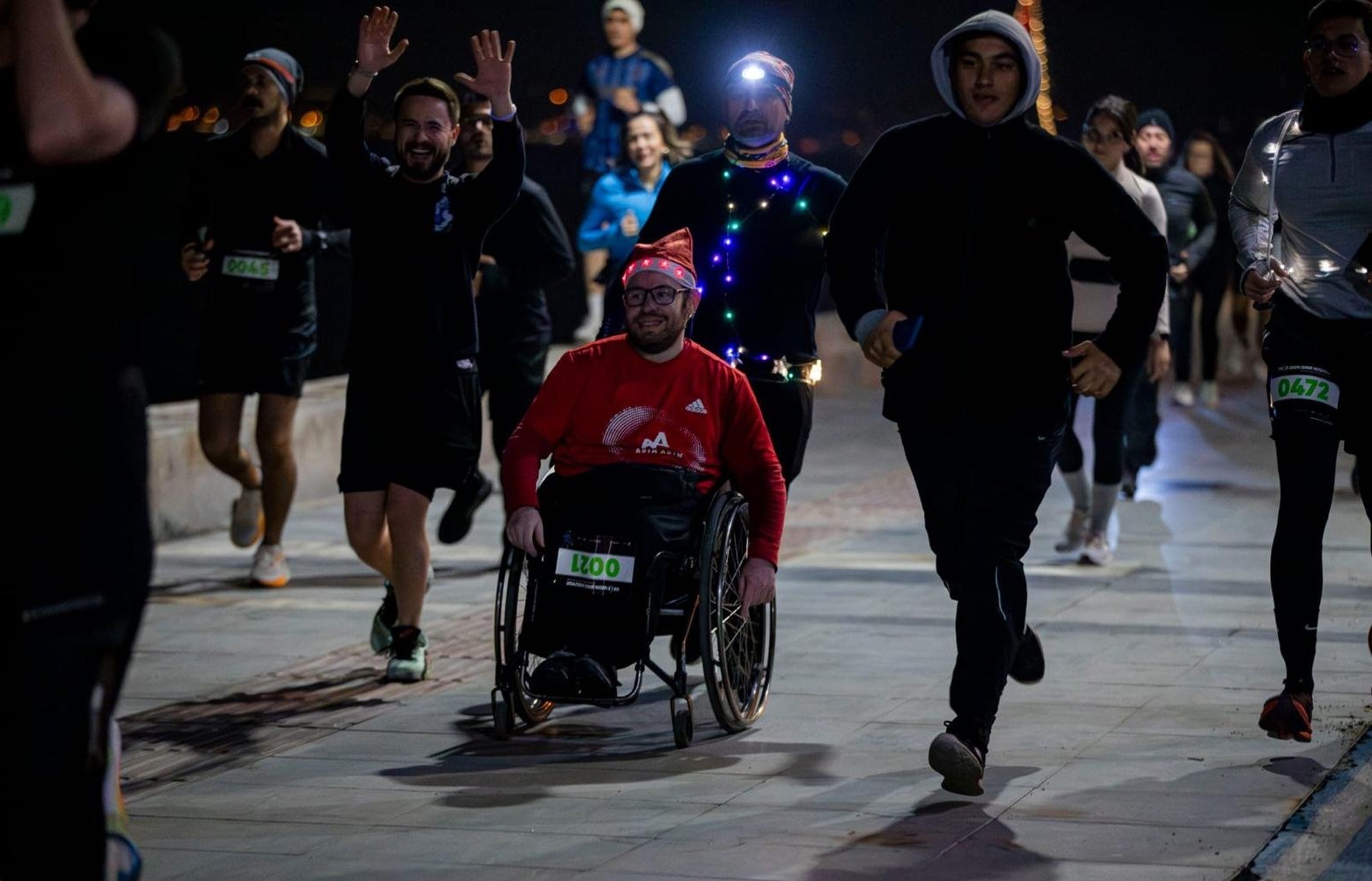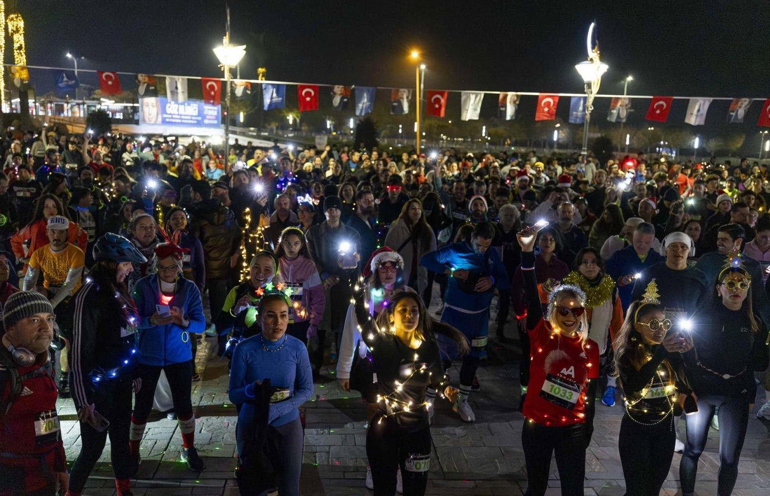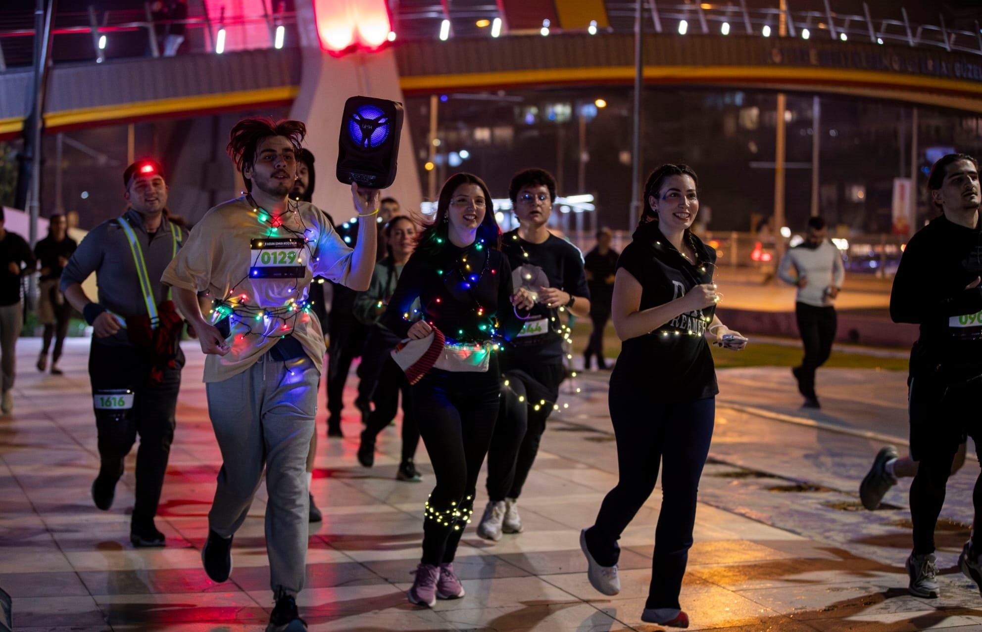 Katılımcılar geceyi aydınlatan koşu öncesinde Saat Kulesi önünde ısındı, start ise 21.12’de Konak Vapur İskelesi önünden verildi. İzmirliler, vücutlarına sardıkları ışıklar, ışıklı şapkalar ve kostümlerle geceyi aydınlattı. Mustafa Kemal Sahil Bulvarı paralelindeki bisiklet ve yürüyüş yolu üzerinden yapılan etkinlik, İnciraltı Kent Ormanı Engelliler Parkı’nda sona erdi.